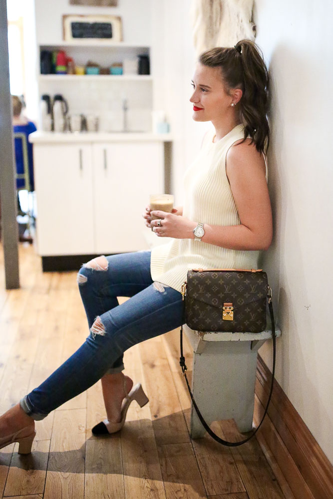 J. Crew: Sleeveless Sweater (on sale!!) / AG: Distressed Denim / Ivanka Trump: Slingback Heels / Louis Vuitton: Pochette Metis / BaubleBar: Mini Monogram Necklace